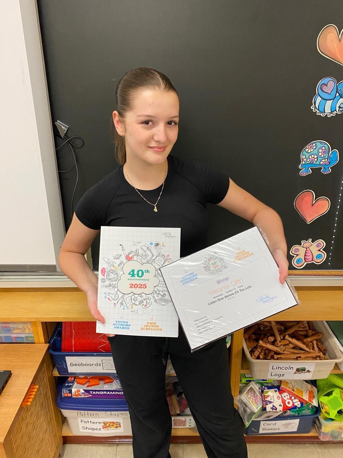 Her poem, Listen Now Before it’s Too Late, was selected in April and publicly announced in June as the winner for the English Grades 7-8 Poem category of the provincial Young Authors Awards/Prix Jeunes Écrivains.
